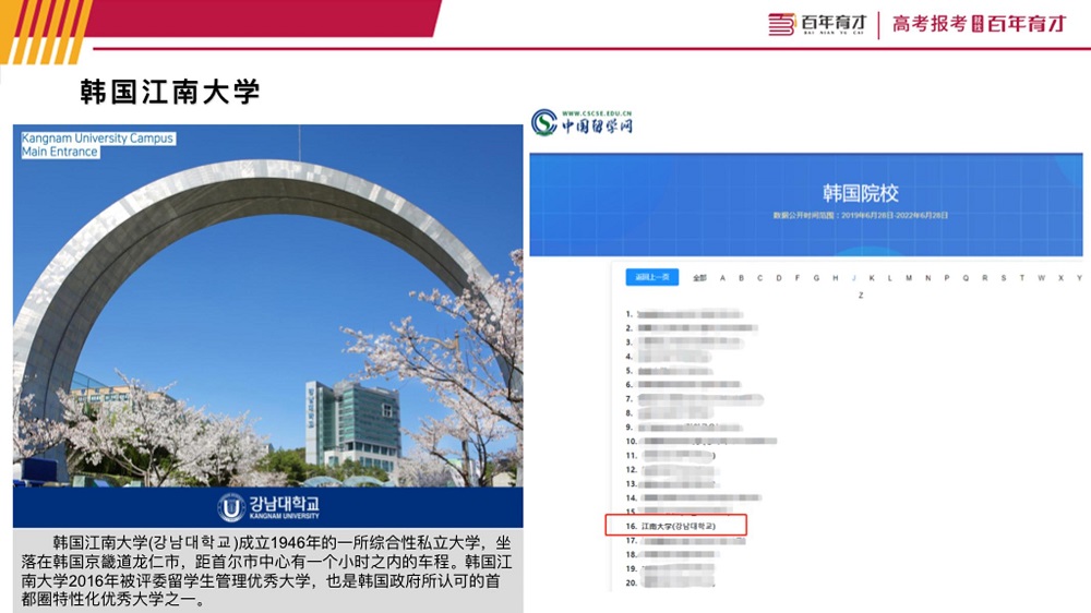 韩国江南大学(강남대학교,Kangnam University)是位于韩国京畿道龙仁市的著名私立大学,也是韩国政府所认可的首都圈特性化优秀大学之一。其连续五年承揽首都圈专业化大学建设支持项目,连续四年被评选为韩国大学教育能力增强项目支持对象。同时还接连入选劳动部就业机会支持项目、青少年上班体验活动支持项目、大学生创新型中小企业体验活动支持项目、国家劳动奖学项目、艺术英才教育院支持等各种政策项目对象。